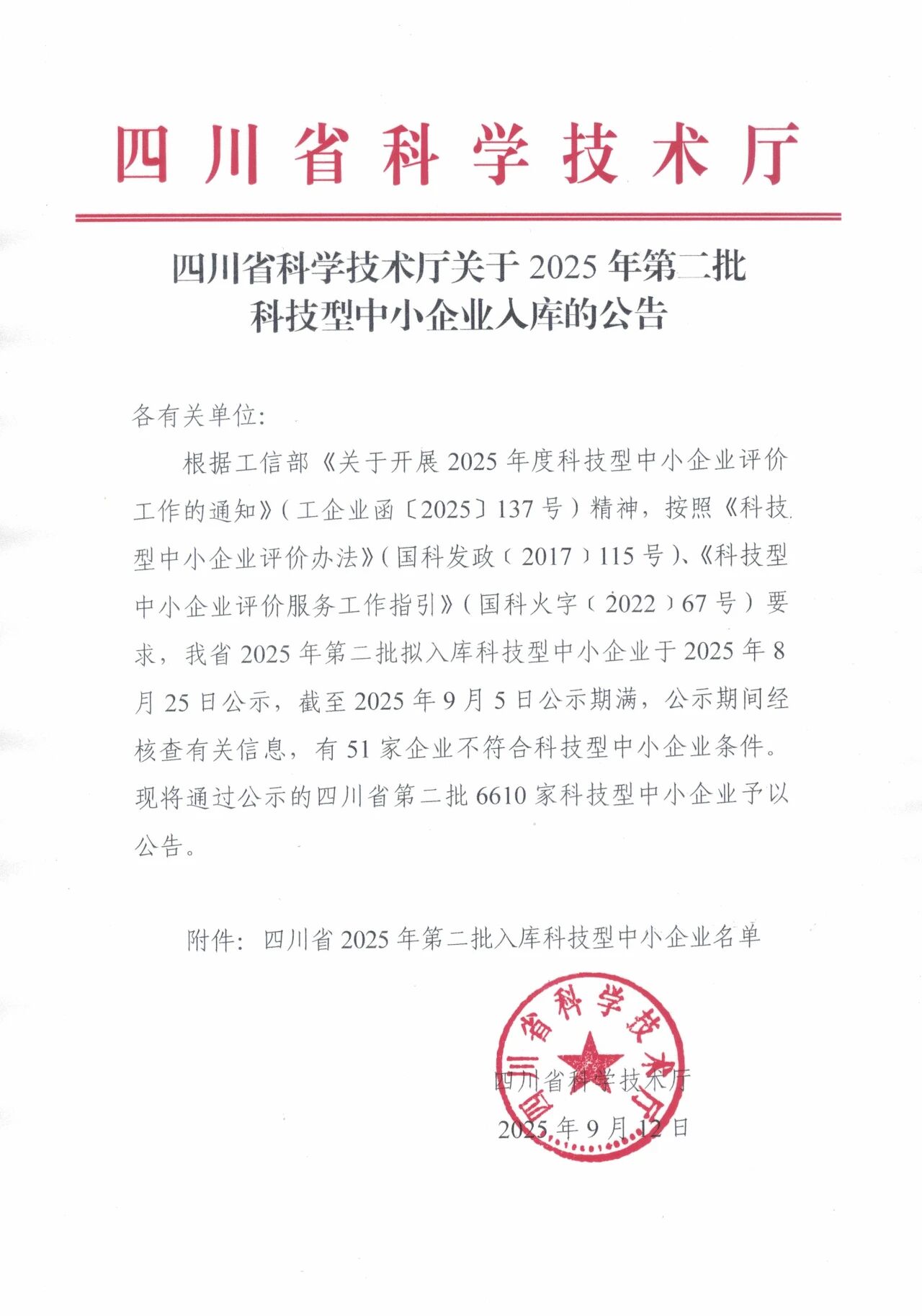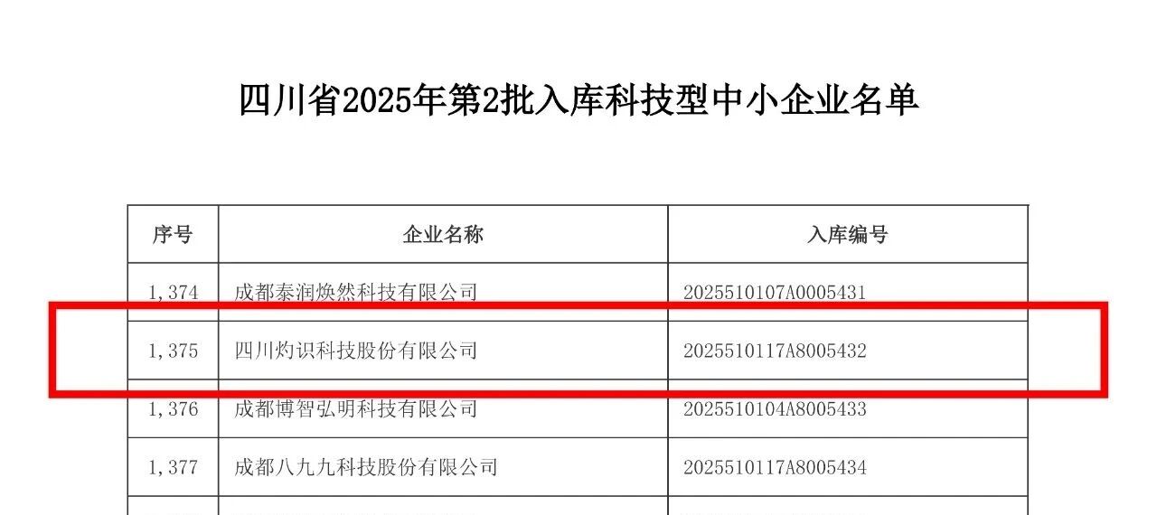 近日,四川省科学技术厅正式公布了2025年第二批入库科技型中小企业名单,四川灼识科技股份有限公司凭借扎实的技术实力和创新能力成功入选。这标志着企业在科技创新与发展道路上迈出了坚实一步。