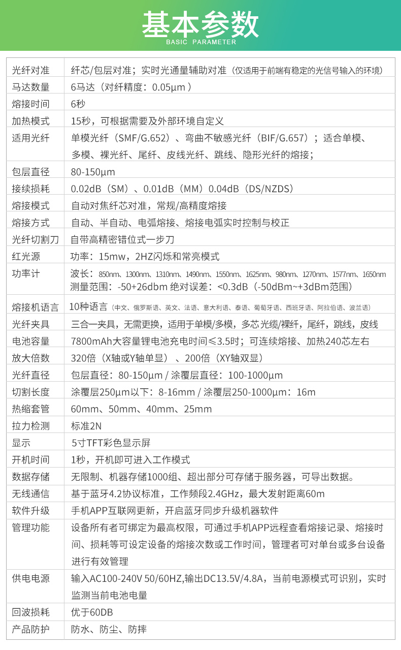 灼识AI-30光纤熔接机应用了灼识多项最新专利技术,同时采用了更高级的中央处理器,更先进的算法,更高精度的摄像头,纤芯更加清晰可见,熔接损耗与熔接的稳定性更加出色,完全胜任更长距离的干线光缆熔接工程。主机、工具箱、全套配件全重仅4.5KG,工具箱尺寸为25.5cmx16.5cmx23cm。在如此小巧紧凑的情况下,同时实现了工作台,板凳的组合设计。1秒开机,6秒快速熔接,15秒加热,5英寸彩色高清液晶屏,320倍放大,7800mAh大容量锂电池可以熔接加热240芯,在高海拔、干燥、寒冷等恶劣环境下依然表现出色。