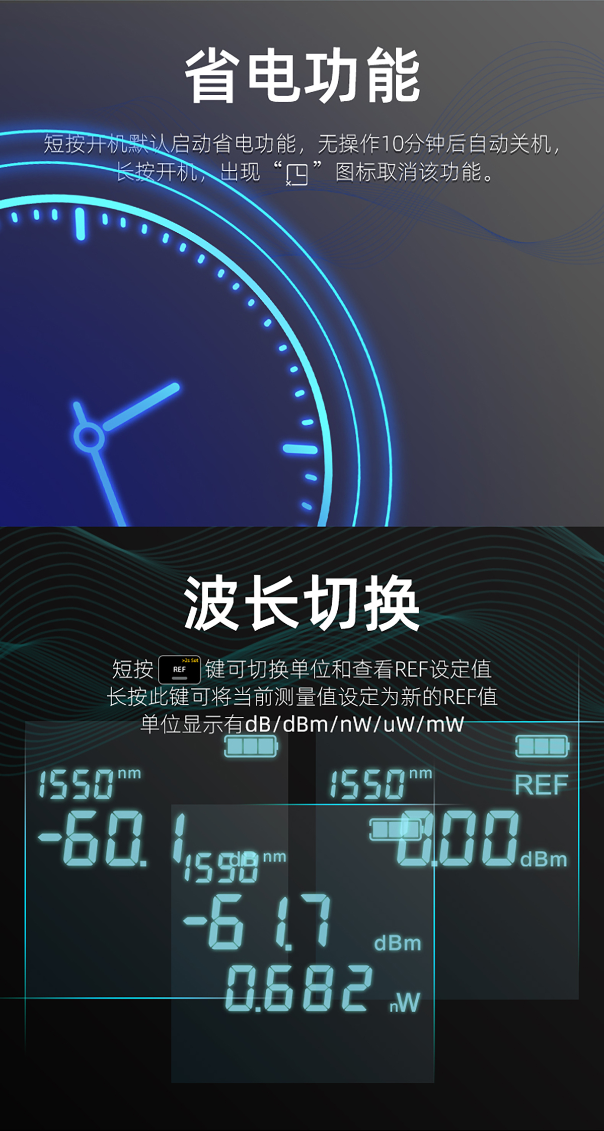 2、高精度光功率计,六波长测试,动态范围80db,测量误差小于±0.2db,支持FC/SC/ST接口。
