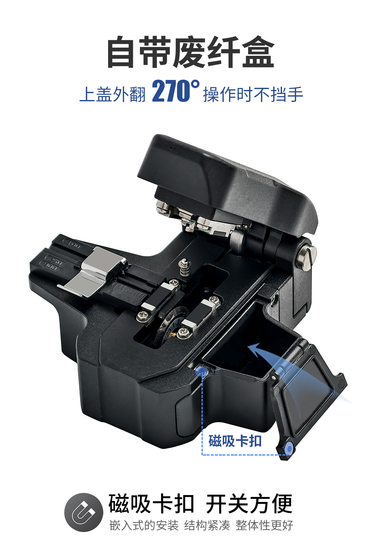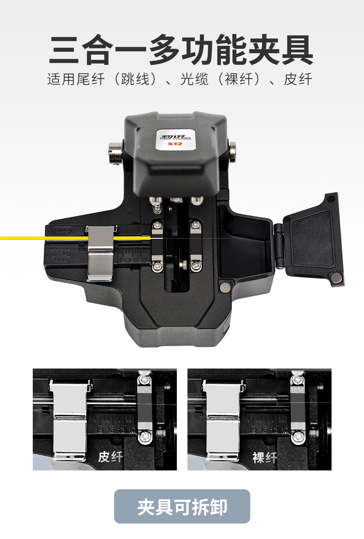 C、三合一多功能夹具,稳定夹持尾纤、光缆、皮纤。