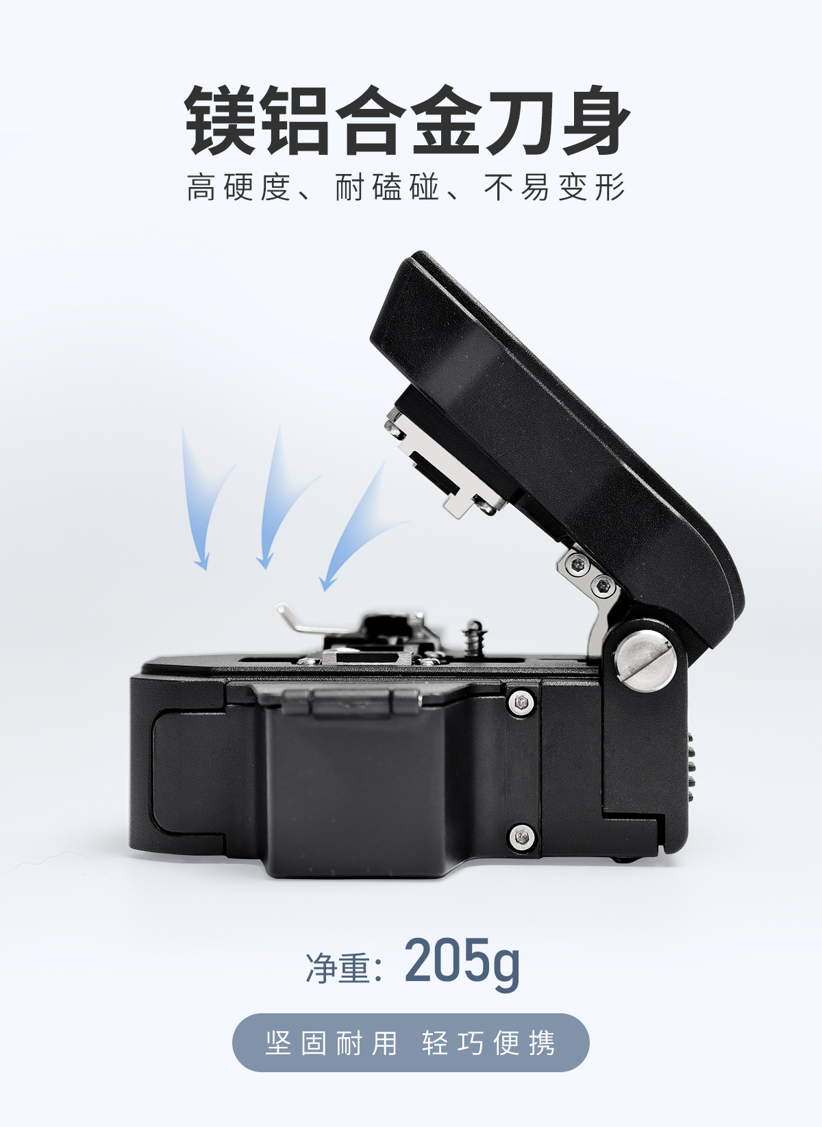 A、镁铝合金的刀身,高硬度、耐磕碰、不易变形,能长久保证切割精度。