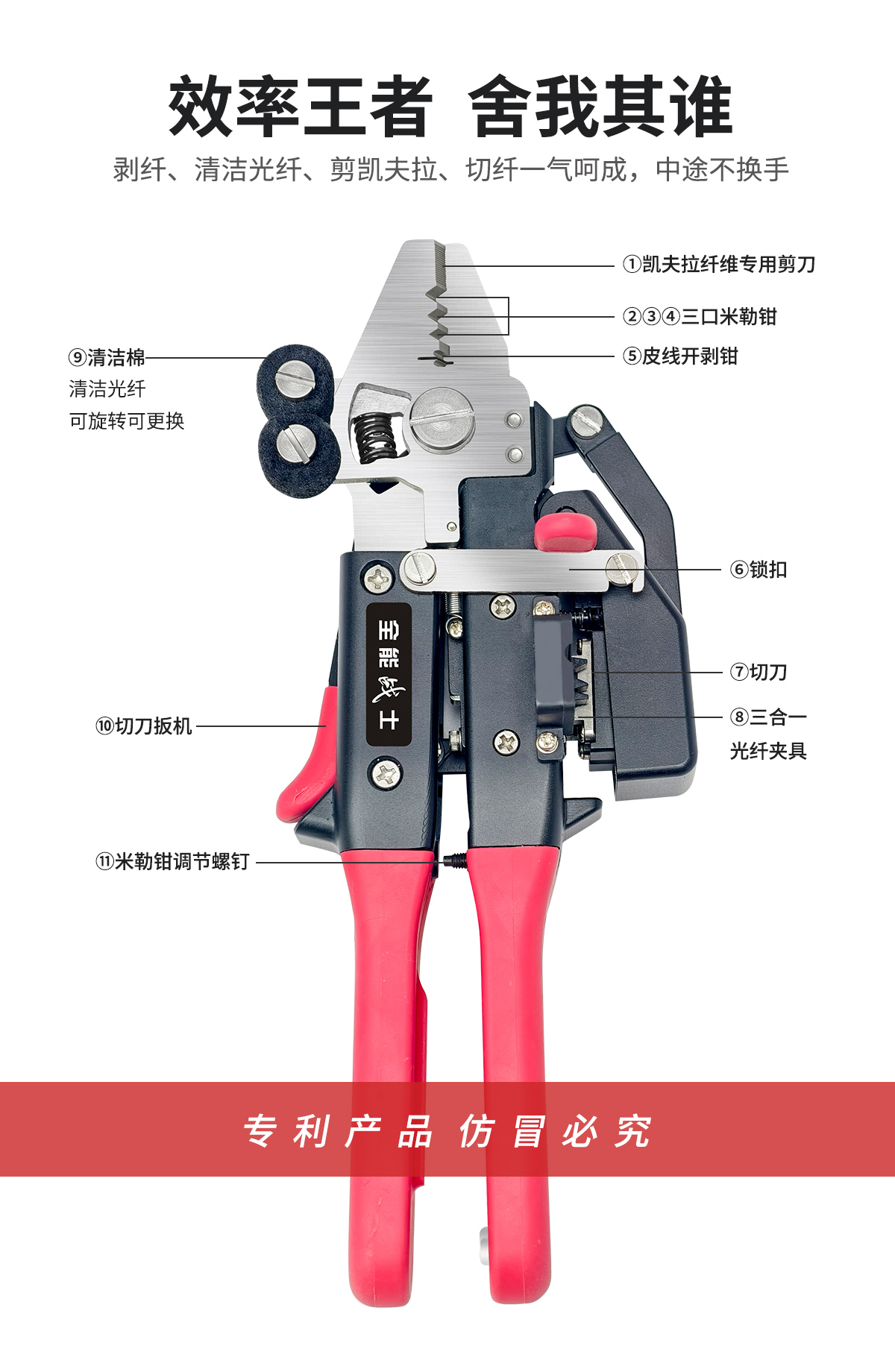 这是一把多功能光纤剥线钳,更是一把高品质一步式光纤切割刀,只为最大限度减少携带,数倍提升您的工作效率;也避免了因为工具种类繁多造成的遗漏和丢失。我们既要保证单一功能的丝滑,又要避免结构间的影响,还要兼顾体积和重量。如今,通过我们的不懈努力,这一把蕴含多项专利的光纤切剥一体刀,正式接受您的品鉴!