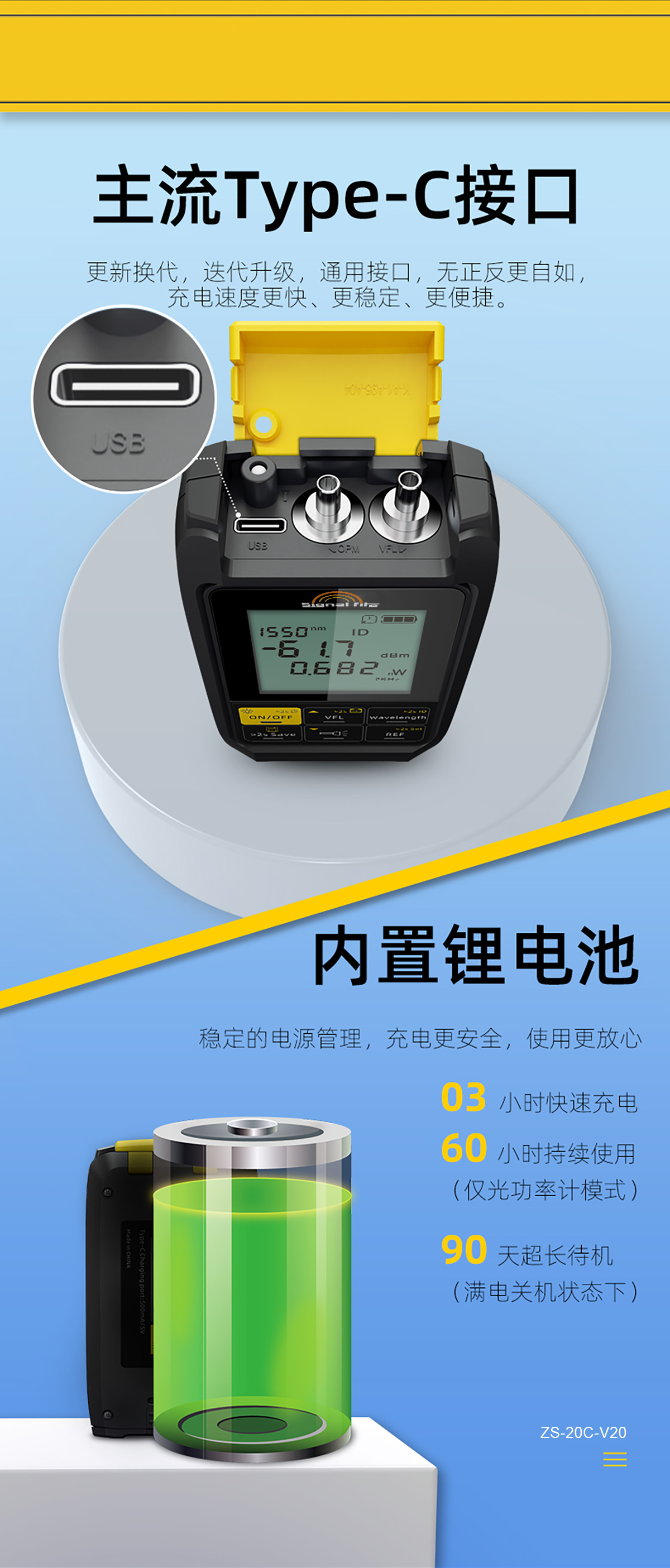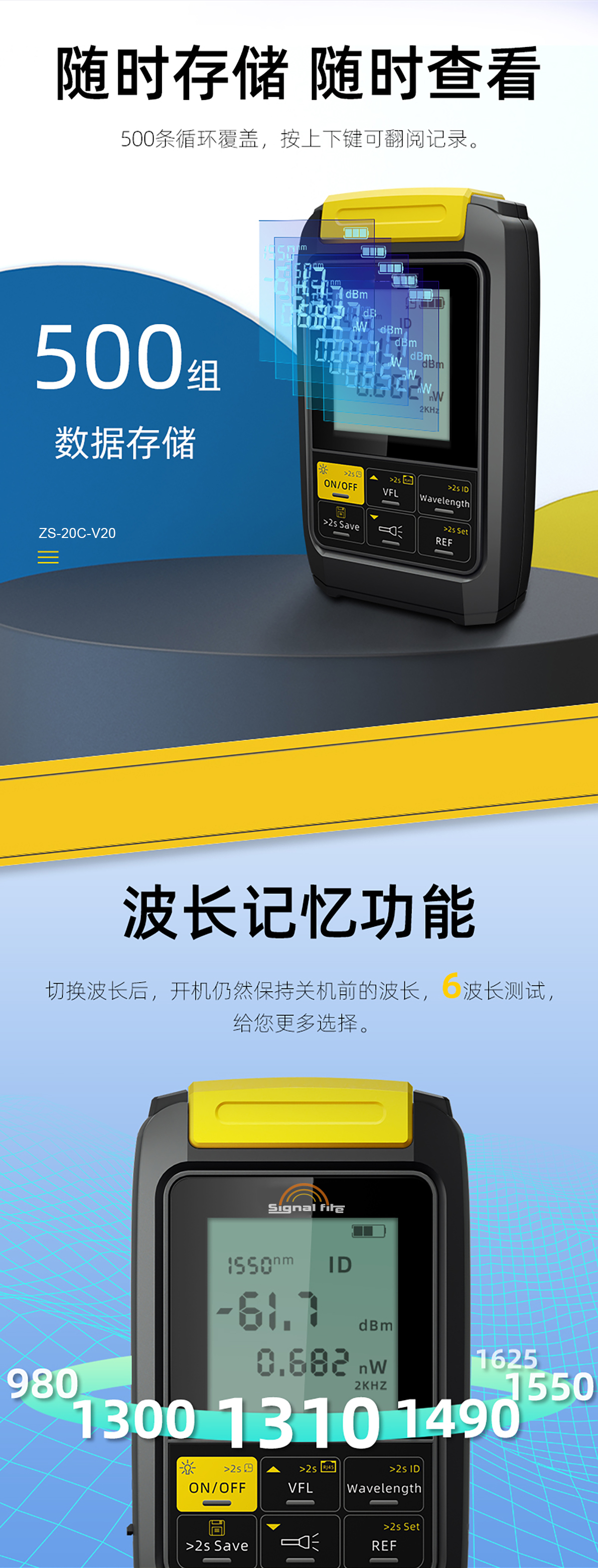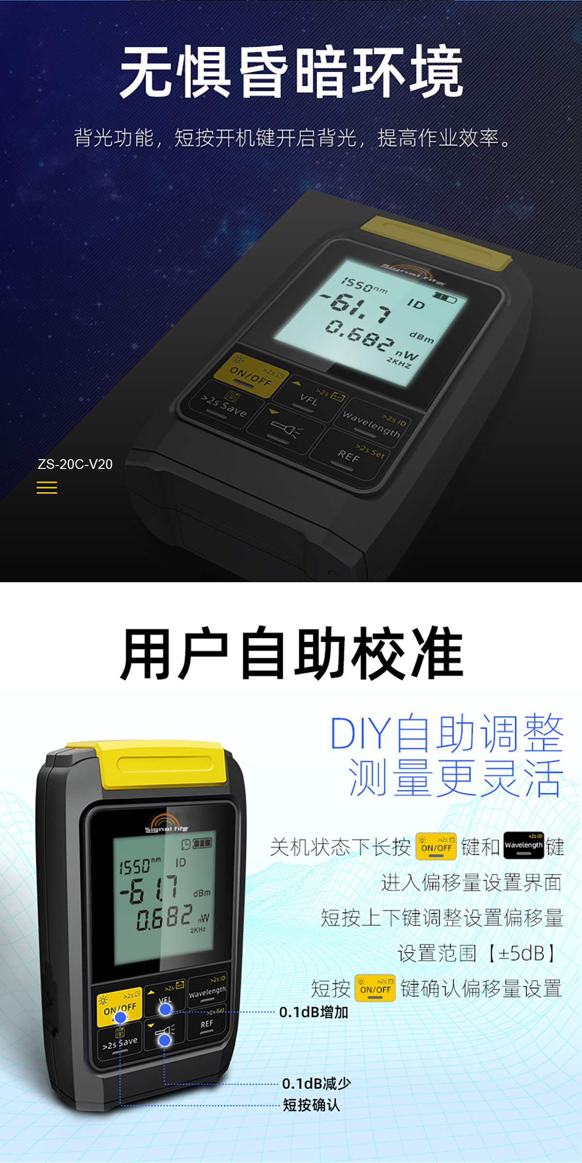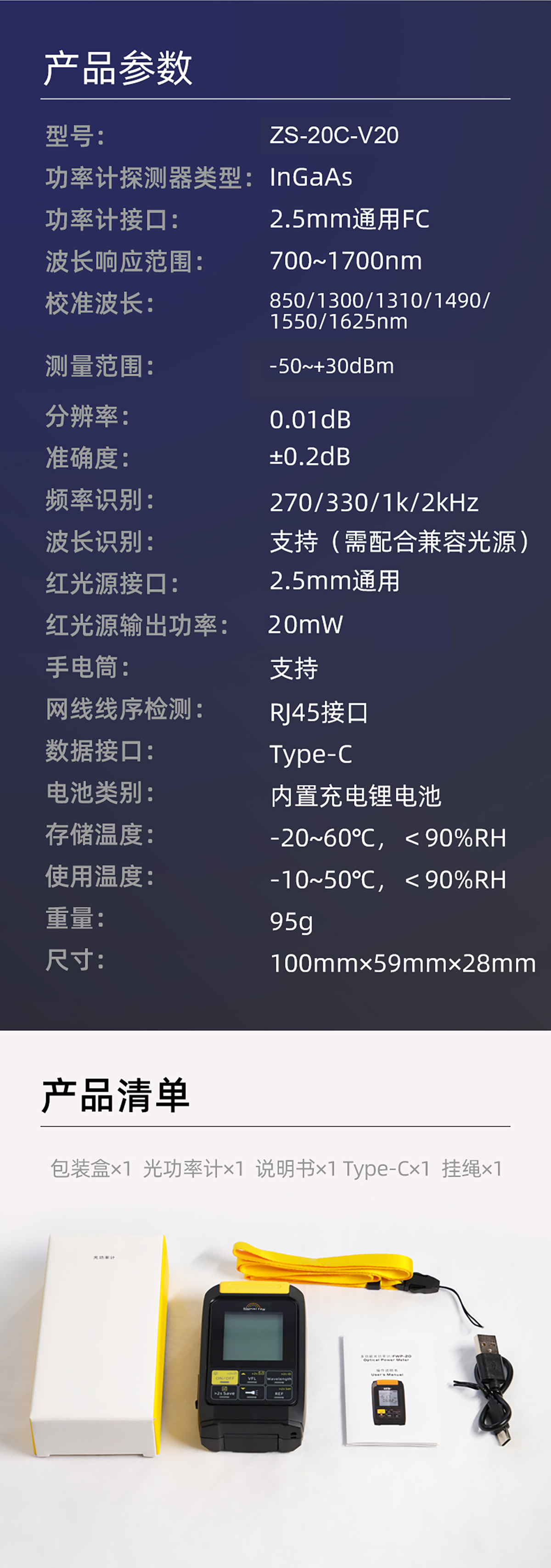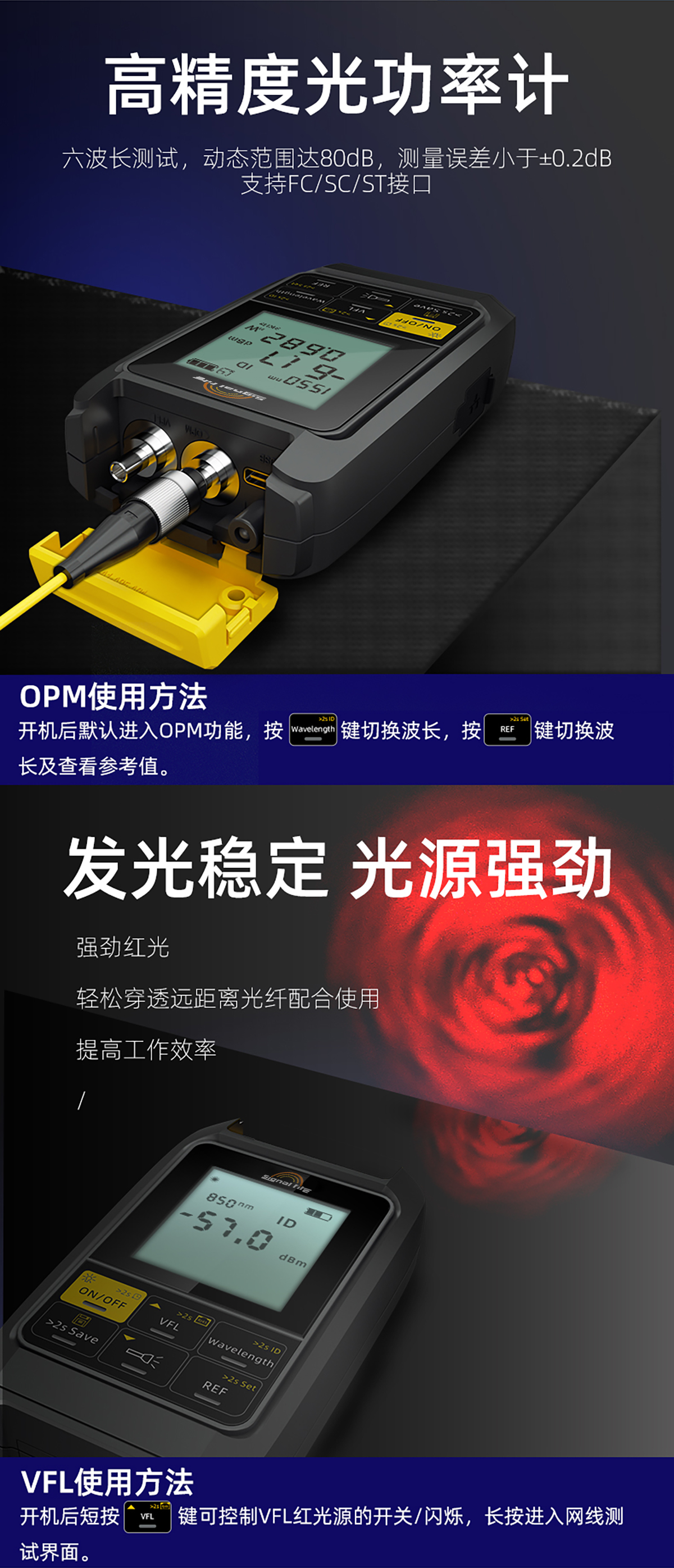 2、高精度光功率计,六波长测试,动态范围80db,测量误差小于±0.2db,支持FC/SC/ST接口。