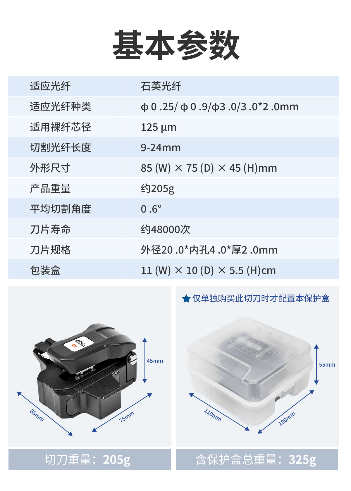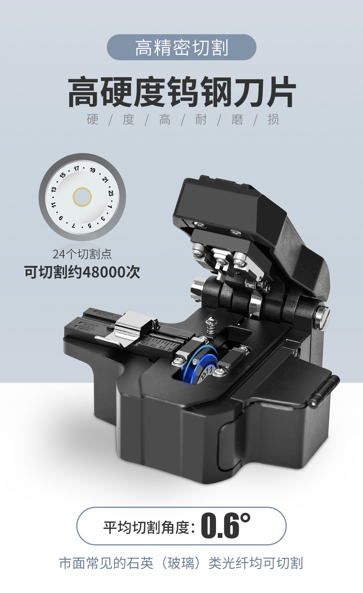 B、钨钢刀片,市面常见的石英(玻璃)类光纤均可切割。