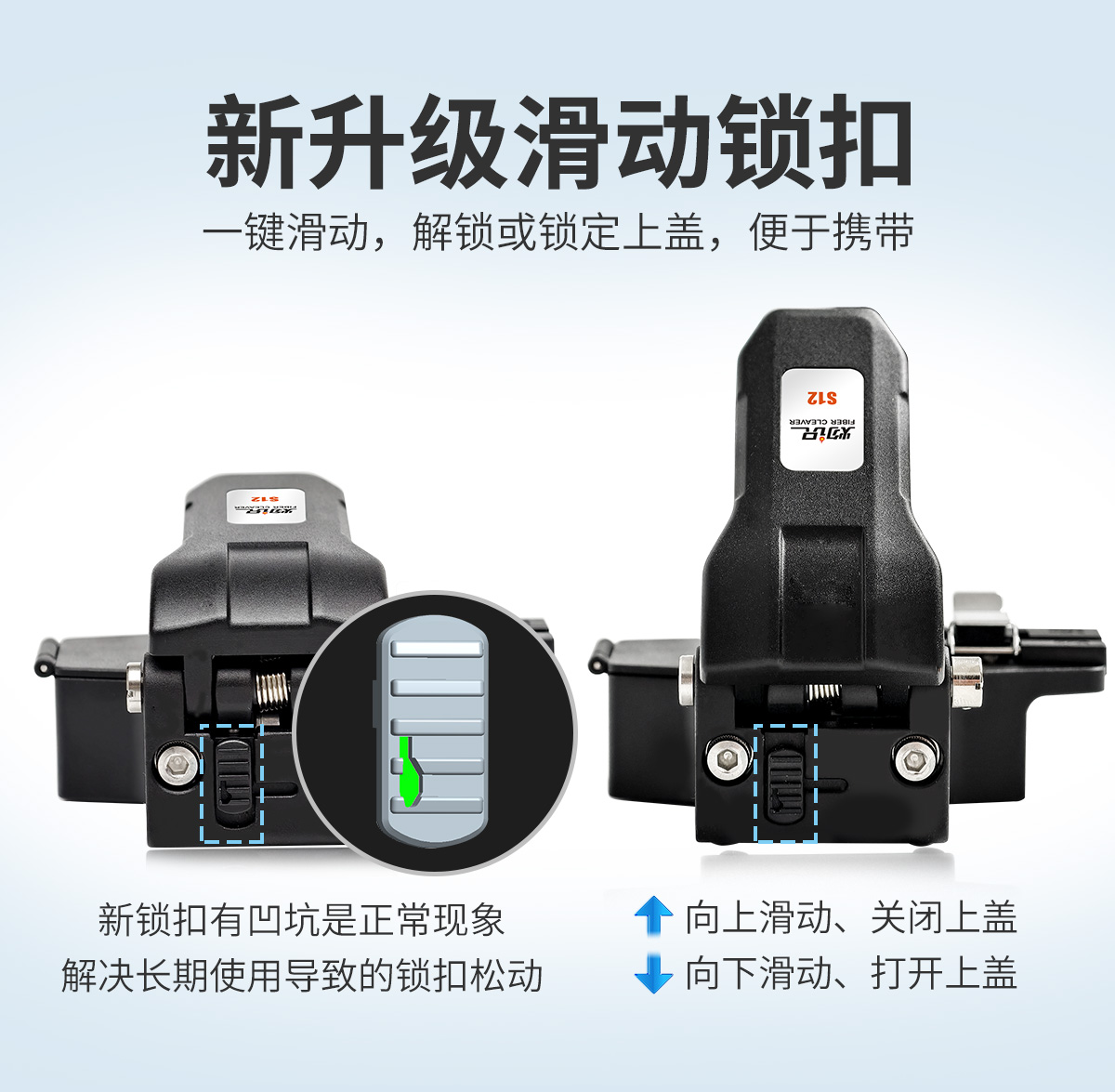 D、新升级锁扣:一键滑动,解锁或锁定上盖,便于携带。